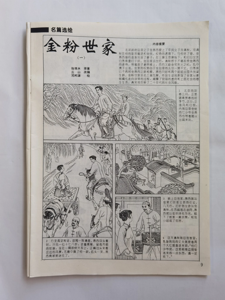第二种连环画诞生在上世纪90年代末,连载于《中国连环画》1997年第7期至第9期“名篇选绘”栏目。丘山编文,邓邦源绘图,内页图幅多达120幅。这种改编本与贵州美术出版社绘本反其道而行之,仅仅用了29幅图便让金燕西与冷清秋终成大礼,其篇幅不足全套连环画的四分之一,侧重于反映大家庭盛极而衰的过程。不过,该作文字质量明显强于贵州美术出版社绘本,基本不见硬伤。另外,为凸显母女情深,冷清秋的母亲冷太太在小说里只是一个边缘人物,但在该绘本中九番登场,成为除金燕西、冷清秋、白秀珠之外露脸最频率的角色。情节也高度忠实于原著,只是为强化戏剧冲突,将冷清秋的寿庆与国务总理金铨中风身亡调整在同一日。受制于篇幅,小说中的诸多精彩情节未予展现,不无遗憾。就绘画艺术而言,贵州美术出版社绘本的若干缺憾均未重复,而且由于邓邦源之前有创作《说岳全传》、《岳家小将》、《唐太宗吞蛇》、《三国演义》等古典题材连环画的经历,这套《金粉世家》不免遗存了古装人物画痕迹,造型略显夸张而不失真。