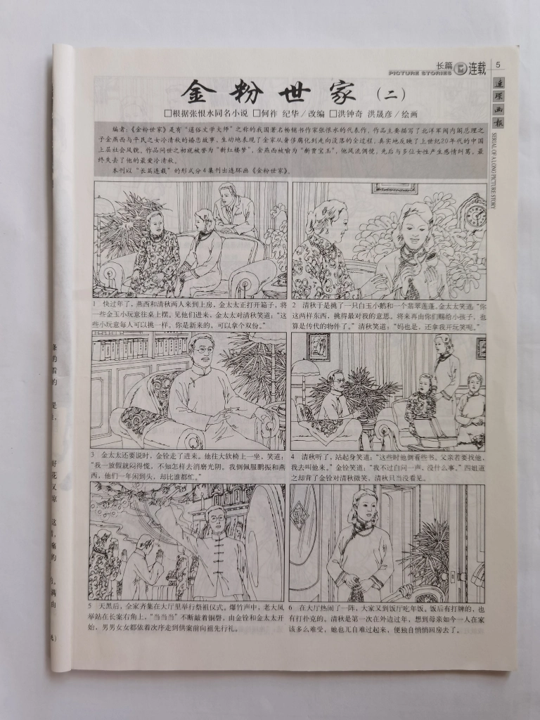 还有一种连环画出现于本世纪初,连载于《连环画报》2003年9月号至第12月号“长篇连载”栏目。这种连环画由何祚、纪华编文,洪钟奇、洪晟彦绘图,由239幅图画组成,数量之多在各种连环画改编本中无出其右者。有“中国连环画第一刊”美誉的《连环画报》相当重视该作品,在连载过程中,其篇名两度登上封面,一次被列为头条,而且精心为每期连载提炼出内容提要招徕读者,如第一期为:“北洋政府总理之子金燕西爱上了平民女子冷清秋,婚礼隆重而热烈,婚后的日子却不平静……”该绘本显然对《中国连环画》绘本有所借鉴,如叙述男女主人公从相识到走入婚姻的篇幅维持在四分之一,又如将冷清秋的寿庆与金铨中风身亡安排在同一日。就画风而言,这种绘本造型恰切,形象塑造写实。我手头涉及两位绘者的资料不多,只知道他们另外还曾经创作出版连环画《山杏》。