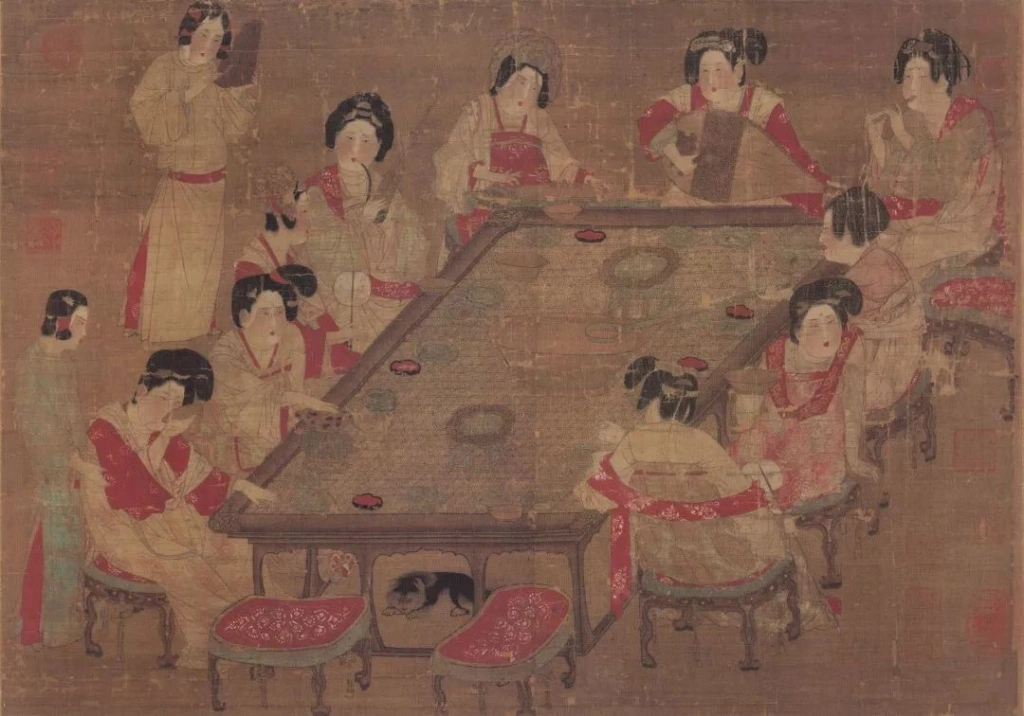 《宫乐图》描绘晚唐宫廷宴饮奏乐场面,人物众多而情态毕现,构图丰满而有序有势,设色秾艳而不失清丽,纹饰华美而条理清晰,俨然一部凝缩的物质文化读本。画中人物的服饰、妆容、发型,宠物、器用、装饰,莫不精雕细琢。