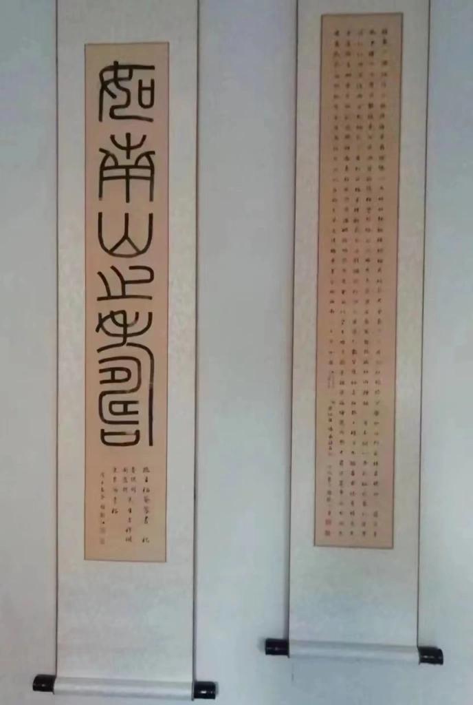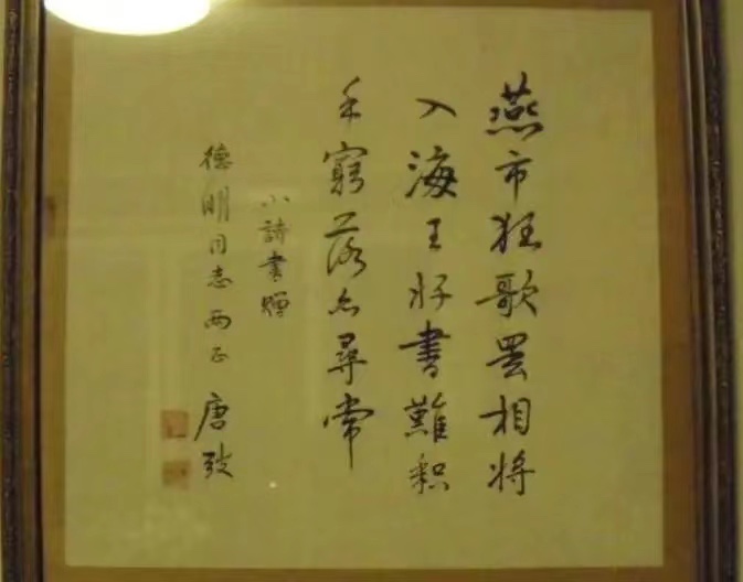 时间过得真快,不知不觉,一个多小时过去了,子仪提议一起合影留念,四人一起,请先生哲嗣姜旗帮忙,拍了一张照片。先生和子仪居中,谭老师和我两边。仔细看墙上,靠右镜框里,是藏书家唐弢赠先生的字:燕市狂歌罢 相将入海王 好书难释手 穷落亦寻常 小诗书赠德明同志两正 唐弢。对于此赠诗,先生《唐弢的信》中说,唐弢一九七七年十一月二十日来函:屡蒙索字,不胜汗颜,实在因拙书太不像样。前些时曾专作一诗,结果因写得不好,撕了。诗为五绝,专以赠阁下者,辞云:燕市狂歌罢 相将入海王 好书难释手 穷落亦寻常 。不知尊意如何?倘觉不恰,自当改削或另作,只怕别人见了,以为尔、我竟以鲁、许自视耳,一笑!此赠书先生极为看重,言“如今已成为寒斋的一件珍贵纪念物”。中间和左边为赵龙江老师为先生祝寿所书,中间是〇六年先生七十七岁寿时抄录(明)吴伯裔《墙东诗自记》,左边是〇八年先生七十九岁寿时临篆刻家、西泠印社创始人之一王福庵“如南山之寿”。之后,先生送我们到门口告别。
