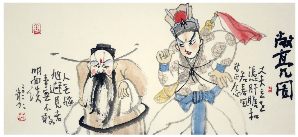 中国戏曲和中国画在大的理念上是一致的,即意象表达。虚实相间,以虚表实。所以说,中国戏曲不仅为画家提供了“戏”这个媒介,而且在具体的表现手法上,还给画家贡献了大量可供借鉴的招术。