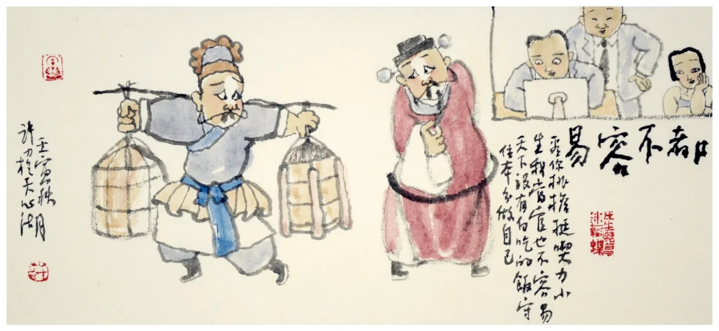 得入戏!画一张戏画,不是“咔嚓”一闪留一个“截屏”或一个造型就完事儿了。要看全本的戏,理解戏。然后让自己入戏,让自己成为一个角色,画出自己的想法。所以,我管自己的画法叫“以戏出戏”。以别人的戏,画我的想法。借古可以讽今,借戏可以喻世。我画的是戏,说的都是我今天的心事儿。