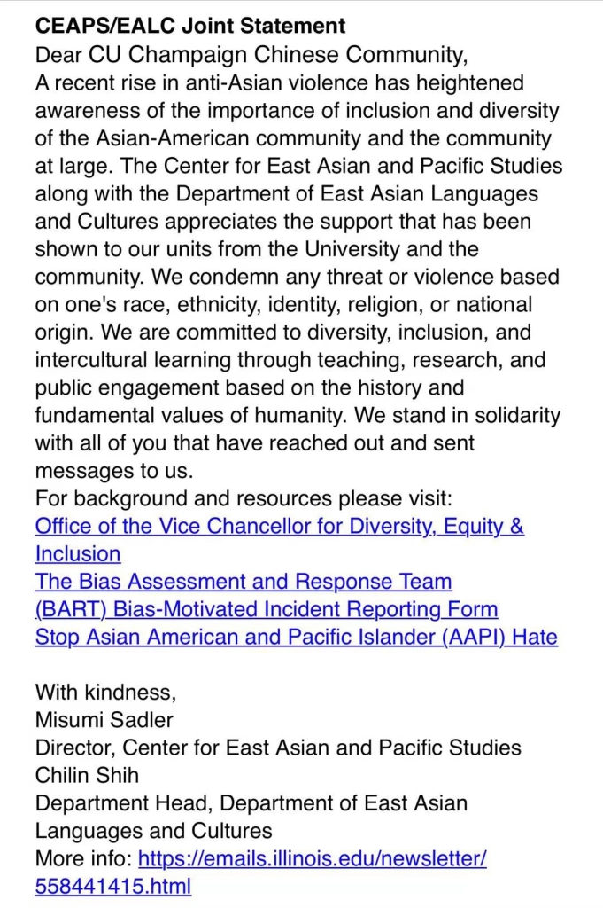 伊大东亚及太平洋区域研究中心主任与伊大东亚语言文化系主任近日代表各自部门发表联合声明,谴责针对亚裔的暴力行为。联合声明原文如下: