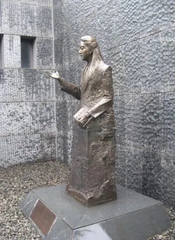 南京纪念馆前矗立的张纯如雕像,底座是伤痕累累的南京古城墙