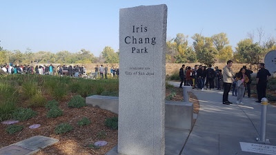 2019年11月9日,张纯如公园在北San Jose揭幕!湾区华人奔走相告,微信又一次沸腾了。家住Plesanton相隔近一小时车程的女友知道我一定会去,约我同往,我带上了老大。公园坐落在一处居民区旁边,占地有2.6英亩,另一侧是树林,景致甚好,静谧宜人。可是这一天,附近的街道停满了车。据说当天有三百多人参加,不但有华人还有很多白人,出席揭幕仪式的有圣荷西的市长、议员,公园的设计师还详细地解释了各处设计背后的含义。Iris的母亲张盈盈女士的致辞感人肺腑,让人不禁动容。我还记得有两位老人手捧着Rape of Nanjing一书,神色凛然,摊开的书皮里是张纯如的亲笔题字。