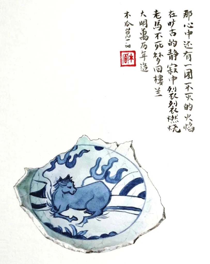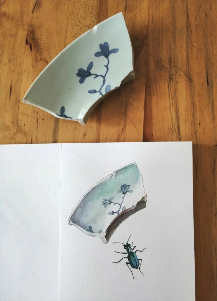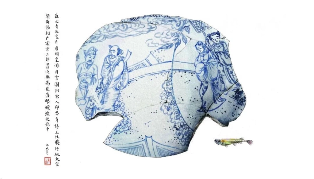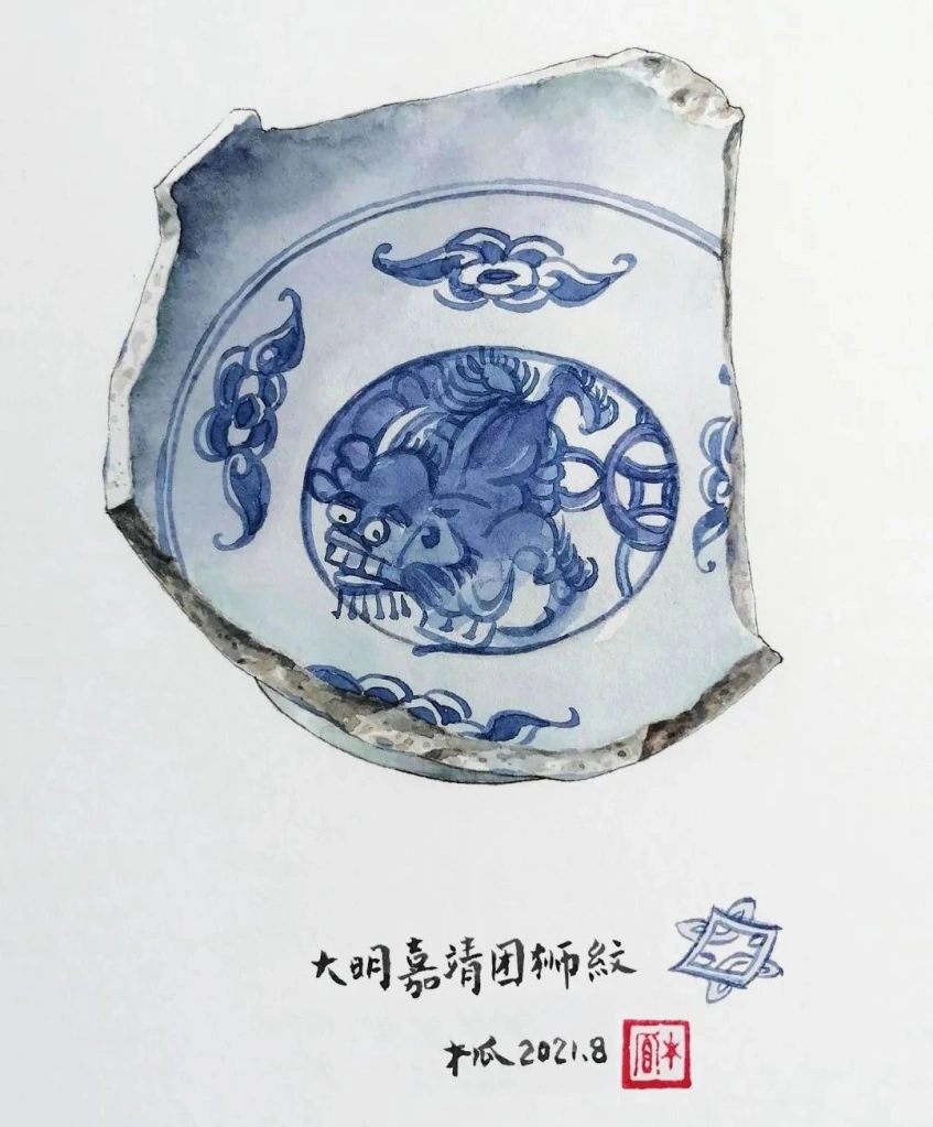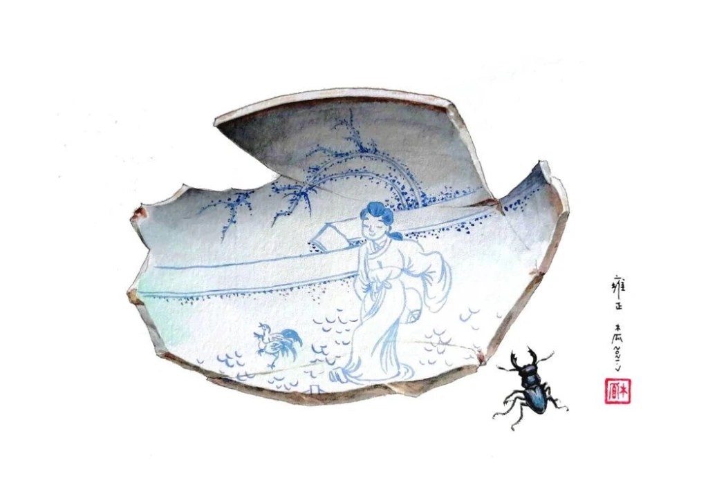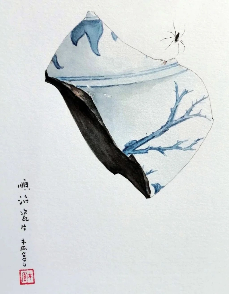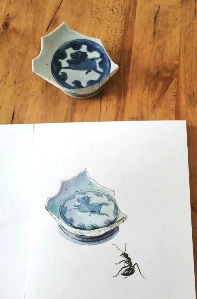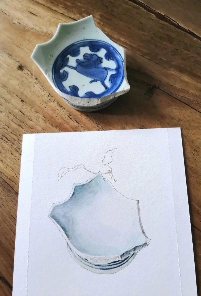 因为我爱人喜欢收藏,十几年来我耳闻目染。他收藏了许多瓷器,明清瓷器、高古陶瓷都有,还收集了几大箱的瓷器残片。闲来无事的时候,他喜欢擦拭观摩瓷片标本,样子很入神。受他的影响,一段时间我痴迷上画瓷片,我发现瓷片上的图案有一种令人心生宁静的“残缺美”,它不完整,却能真实传达遥远过去的时代信息。于是我画了一个系列。”