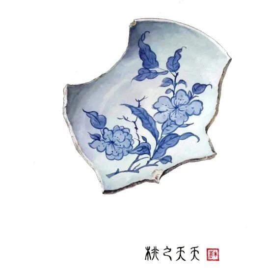 当水彩遇上青花瓷,让人直呼天作之合——水彩的通透、明丽与柔和,最大程度发挥出了瓷片的美感。