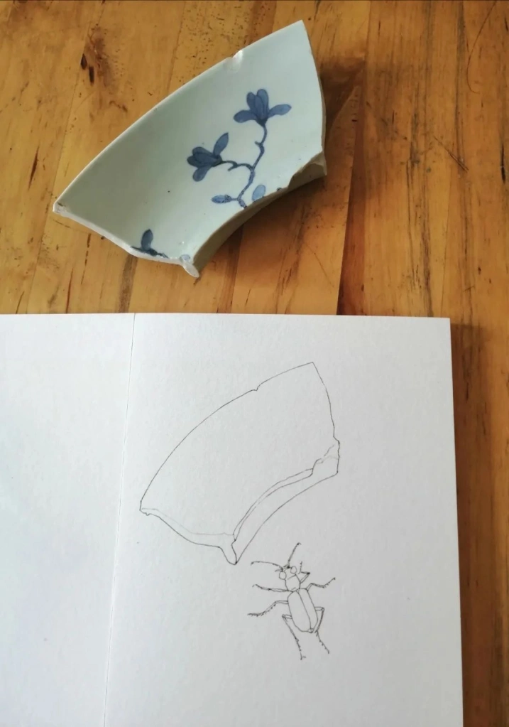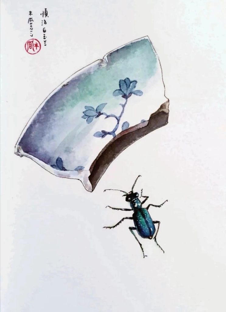 只画瓷片略显单薄,添上各种昆虫或是花瓣、枝叶,更显风趣。花草昆虫为生长者,是动;瓷片本没有生命,是静。动静结合,生命力似乎就要冲破画纸。
