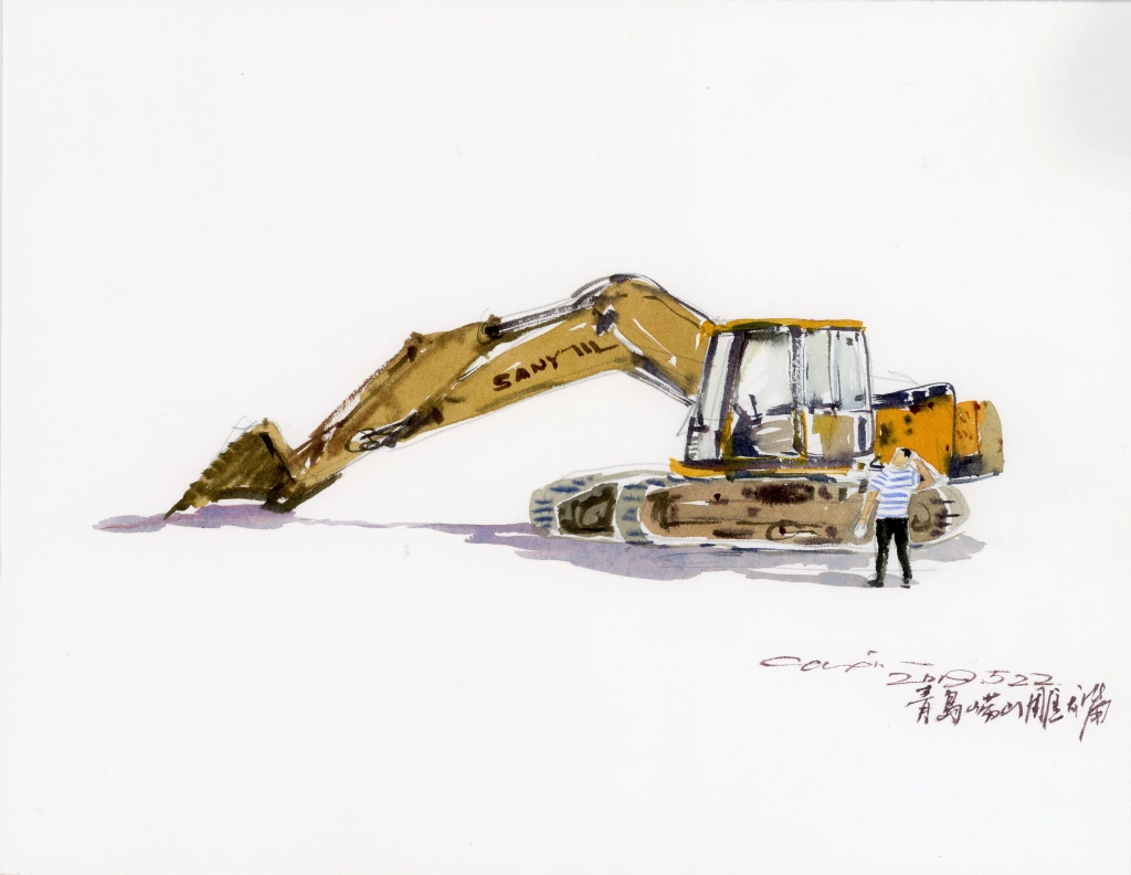 “挖掘机技术哪家强,中国山东找蓝翔!” 这个场景主要是颜色吸引了我,是一种我看了之后特别有感觉的黄色。师傅本来穿的是黑色短袖、黑裤子,我画成了海魂衫,这样看上去显得更突出。海魂衫的蓝白条纹可以把后面的颜色衬出来,也更浪漫一点。画画的人在看到东西时,脑子想的有时是转化!