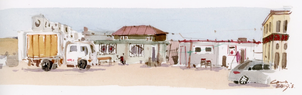 用铅笔简单勾勒起个稿子,才刚画了几笔就来了一辆白色的货车,挡住了我一直没想好怎么处理的一个局部,这反而让我来了劲儿,想要让它也入画,料想这车肯定待不久,我只能尽快用眼睛看,用心去记,用最迅捷的笔触去记录。就在抬头一刹那,车要开走,我努力记下司机师傅的样子。还是没有画完……