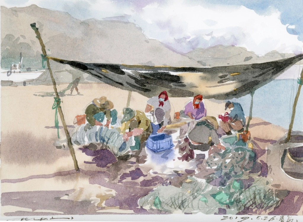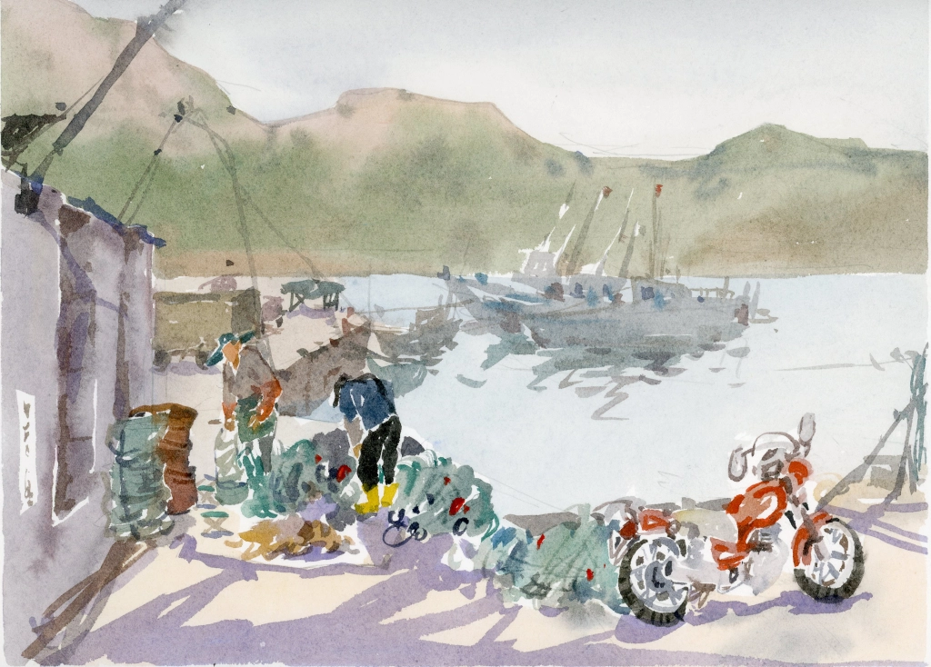 我不喜欢孤零零的风景,不是不能画好,只是觉得少了点什么。我喜欢故事,至少要能让我看到故事。这张是中午下课回住处时在路上看到的一幕。一个大叔在补网,中午太阳很大。绿色的渔网——是我喜欢的那种不扎眼的、粉粉的绿色,其实这张网原本应该是那种很扎眼的绿,但经过时间的打磨和洗练,变得灰灰的,实在漂亮,以至于后面有类似的场面时,我都经常会让它出场。
