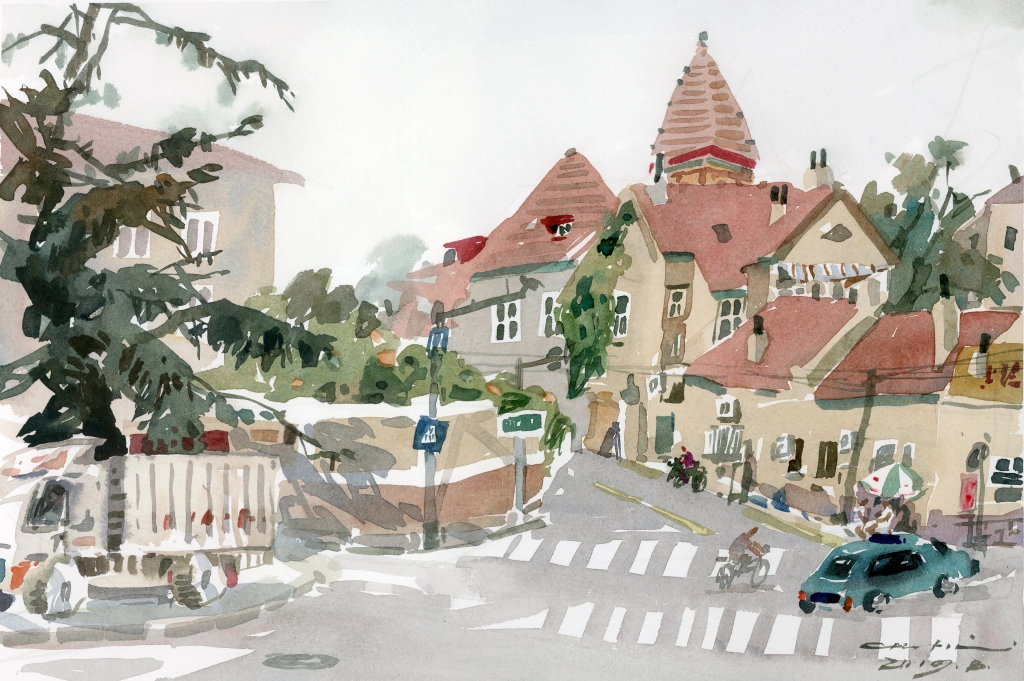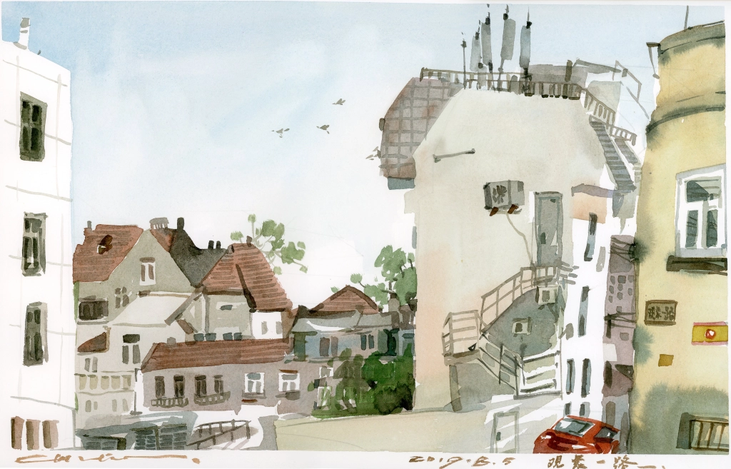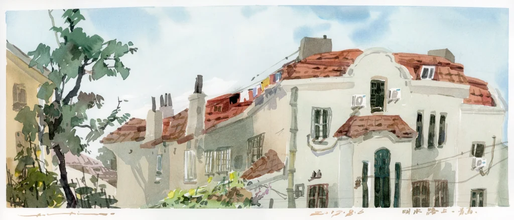 需要解决的问题简直数不过来。对我而言,怎么用简练的笔触、块面的形式把这些建筑表现出来,是一个挑战。近景建筑的种种特征也需要挖掘,并落实到纸面上。还有中景的室外楼梯需要表现。青岛的阳光,炽热的同时也分外的美好,不画也非常浪费。只有近景、中景、远景都画好,才能凸显青岛房屋的特色。