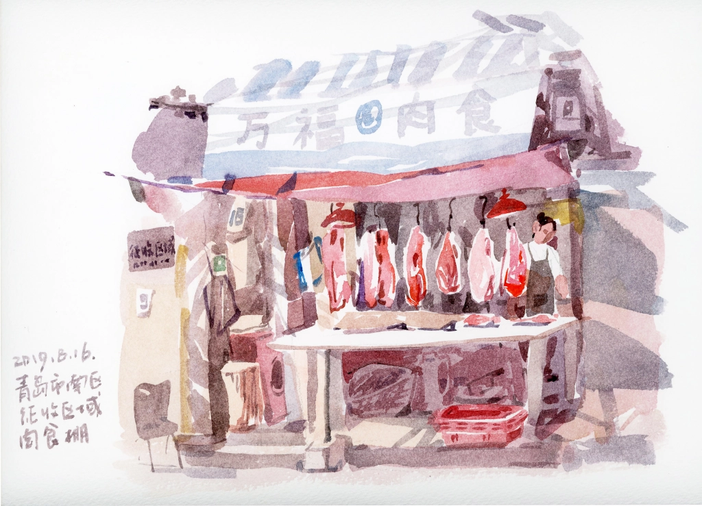 这一张画的是即墨路上的肉铺,很喜欢“即墨”这个名字,好听。听说这里要拆迁了,我不喜欢拆迁,社会发展得有点儿快,我总有点儿不太踏实的感觉。在青岛写生就画到这里了,没有画够,也没有实打实地画海。快九月了,海边那些渔民开渔了,我们也要交作业了。
