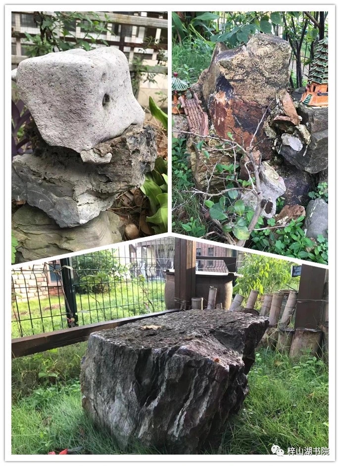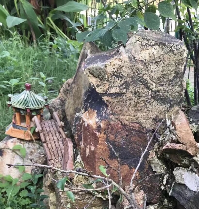 不唯躬身垒石,当初筹划小院布局,余就谢绝了园林公司的图纸,因余想要的并非一个亭台水榭的私家花园,而是一个宜居的农家庭院风格的小院。故余亲自设计,因地制宜垦菜园、掘池塘、打井筑台、砌柴灶、竖烟囱、垒石为桌凳。小院既成,余蹀躞其间,整日与草木土石打交道,常常打量石头沉思,琢磨它们的来历。