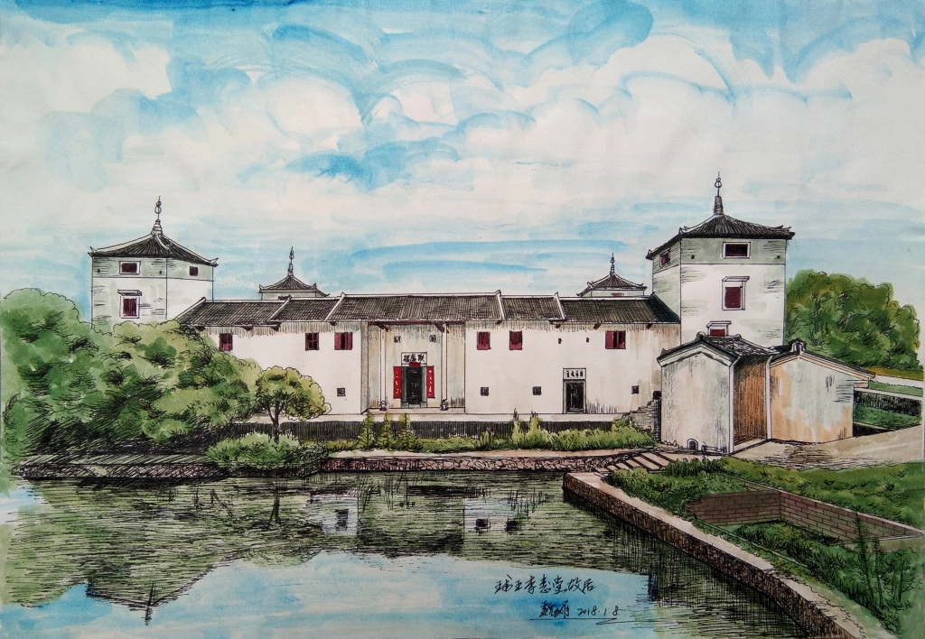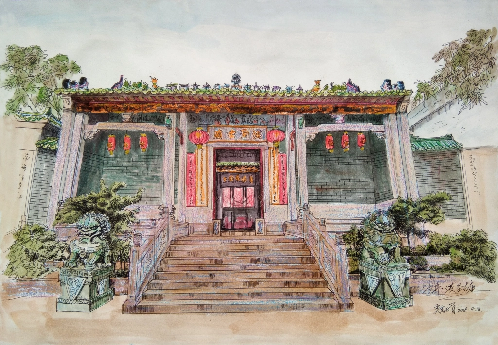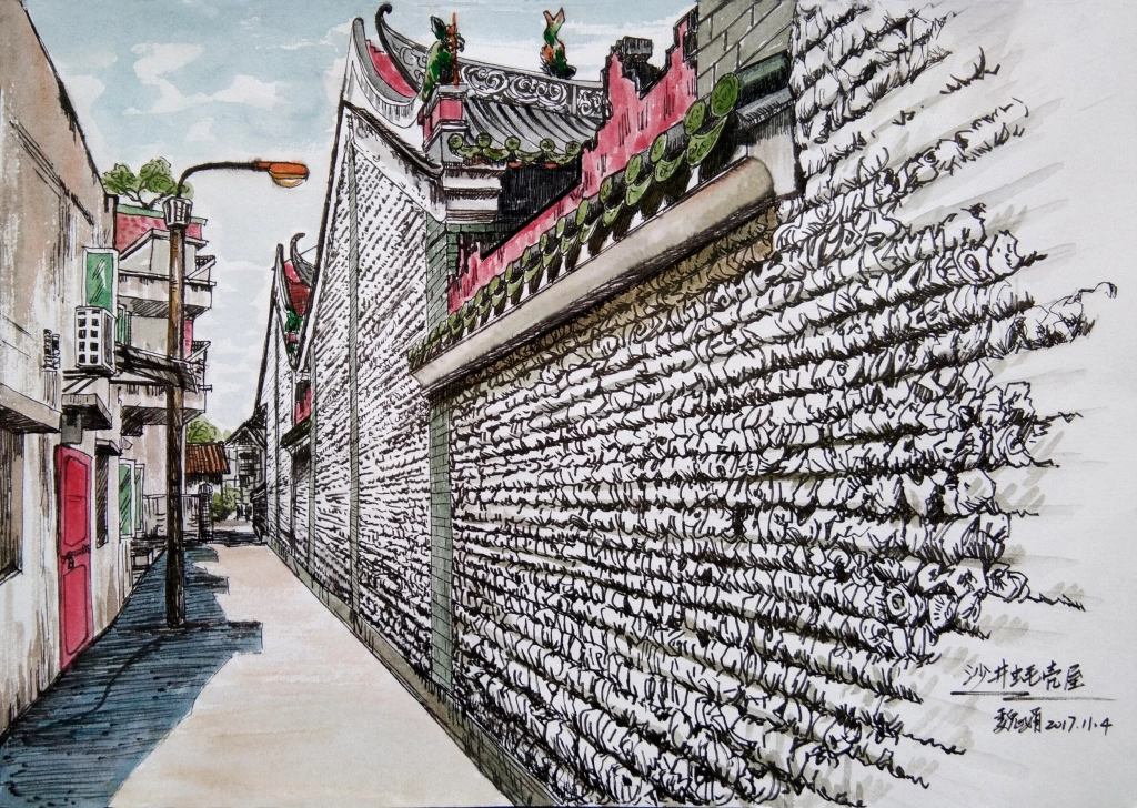 在参与“印象深圳——诗画宝安80景”采风活动中,深深地为宝安的古建筑所吸引,于是采用了钢笔淡彩的绘画方法去表现它们。钢笔淡彩,是我曾经在读大学期间外出写生时经常用的绘画方法。钢笔淡彩画面效果精致却又简洁明了,画建筑物尤为快捷,容易出效果,因而深受画家的喜爱。又因为钢笔淡彩画材料、画具简单、有效,只需要一支吸饱了碳素墨水的美工笔、一小盒块状的水彩颜料、一支毛笔和一小瓶清水,有时在小溪边,直接就在小溪流中蘸水调色。