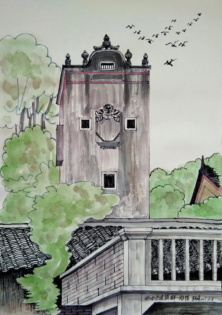 当来到“绮云书室”面前的时候,深深被古建筑的宏伟和外在的精美所吸引,回家后创作了一幅钢笔淡彩画。在创作此画时,我重点勾画建筑物的形体、结构,从勾勒的线条和颜色上着重表现建筑物的金碧辉煌与大气磅礴。建筑物两侧增添了几缕绿植,让建筑物充满了生气,显得更有书香气。