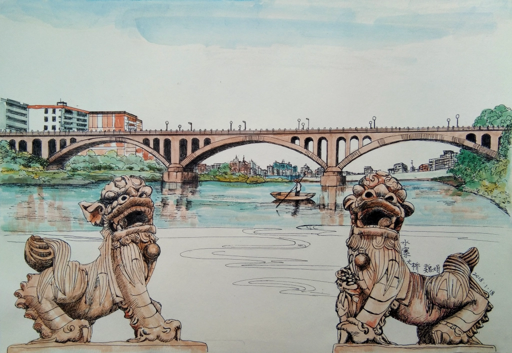 创作这幅画的时候,我把一对石狮子放在画的前面,背景是长长的水寨大桥,突出了石狮子的雄伟与精致,同时把大桥的结构也清晰地描绘出来了。水面上一只小船顺流而下,充满生活气息,这正是大桥赋以的烟火气。