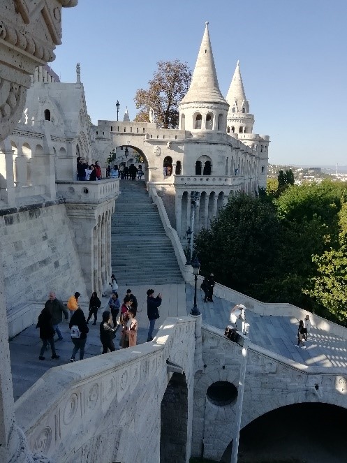 我2015年秋曾跟旅游团到过布达佩斯,可是那天天色渐晚,而且大雨瓢泼。记得所有人都在“渔人堡”躲雨,广场上的马加什教堂在昏暗中只是一个模糊影像。这次到布达城堡,阳光灿烂,马加什教堂露出真容:一个雕琢精细、十分抢眼的哥特式建筑。时光倒转八百年,多瑙河上匈牙利渔民建起了渔人堡,一个中世纪抵御异族侵犯抢掠的壁垒。1255年建成的马加什教堂则提供了当时百姓精神上的寄托。这是中世纪的天上和人间。