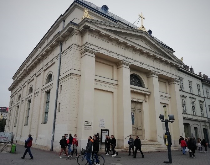 在伊丽莎白大桥佩斯一侧,你能见到布达佩斯最老的教堂(Inner City Parish Church in Pest),建于1046年,是匈牙利国父圣斯蒂芬(Istvan)从罗马教皇那儿获得授权公元1000年正式建国不久的工程。开始是比较简朴的罗马风格教堂,14世纪由两任匈牙利国王改建成哥特式建筑。奥斯曼帝国统治时期(十六七世纪)改建为清真寺,1739年重建为巴洛克风格教堂。