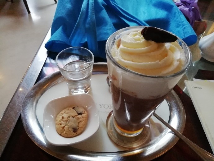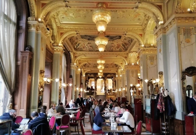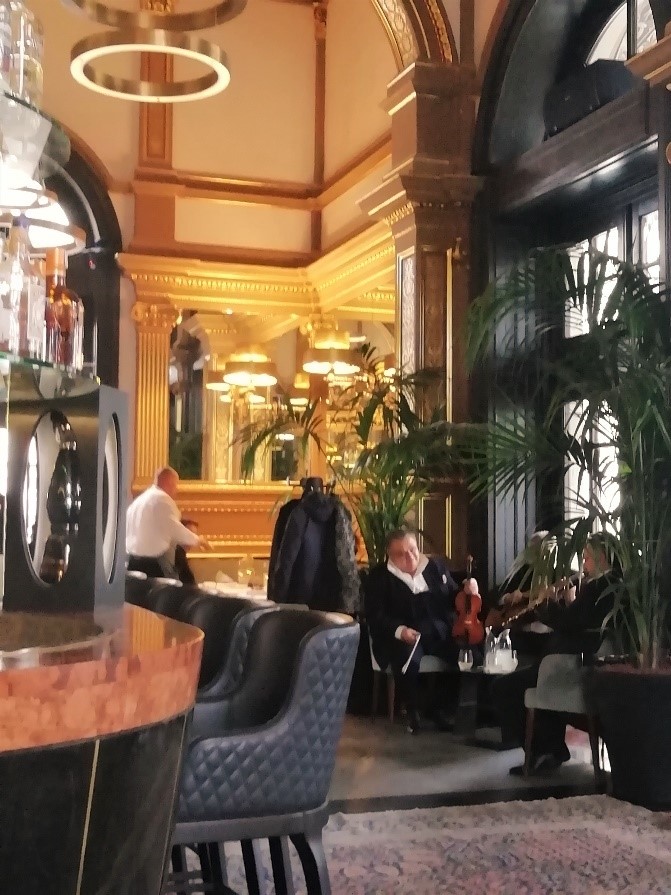 我要了杯掺果子酒Palinka的匈牙利巧克力饮料,味道很好,巧克力酒香,不腻。我座位的边上坐了一对情侣,我跟他们搭话。女孩是西班牙人,小伙子是乌克兰人 ,在布达佩斯约会,颇为浪漫,尤其是在如此富丽堂皇的餐厅,而且带着纽约的时尚气息,再合适不过。不经意的,现场的钢琴手悠悠弹出了《莫斯科郊外的夜晚》,像是给情侣们助兴,但也给我这样的来客带来怀旧的思绪(在大学毕业的演出晚会上,我们毕业班曾经演唱过这首歌)。看来这首俄罗斯名曲也是匈牙利人耳熟能详的一首曲子。