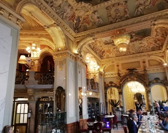 我打着伞,来到“纽约咖啡馆”,这幢名为“纽约宫殿”(The New York Palace)的巴洛克建筑(见左下),实为一家豪华酒店,1894年开张,“纽约咖啡馆”(New York Café)是附属于它的一个餐厅。当年布达佩斯的富豪名媛常在这里聚会。这里的装饰让我想起维也纳,奢华而典雅。我问领位能否就坐Balcony,在上面能俯视整个餐厅。因为二楼不开放,终于未能如愿。