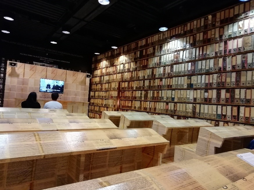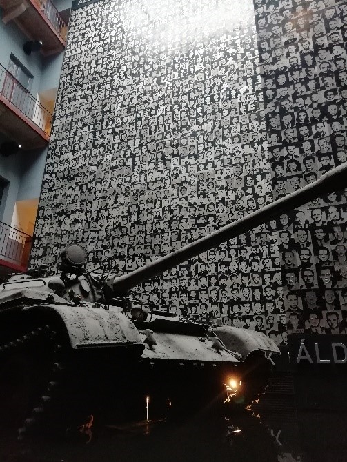 “恐怖屋“里陈列的历史文件和物品,主要是两件事,一是纳粹德国期间对匈牙利犹太人的暴行。最初是犹太人被赶出布达佩斯,后来干脆当作苦力使唤,1944年,二战侩子手阿道夫艾希曼亲临匈牙利,监督将犹太人从布达佩斯押解到波兰的集中营。当年五月到七月不到两个月时间, 从匈牙利押送到波兰奥斯维辛集中营的犹太人就将近四十四万之多。大部分人死于集中营的毒气室。