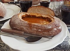 匈牙利语中的 gulyás 指的是牧民,goulash的匈牙利语gulyáshús 便是“牧民做的肉”。成为匈牙利“国粹”的古拉什主要是三样食材,肉(主要是牛肉或羊肉),蔬菜(洋葱),匈牙利甜椒粉(paprika),一般会放土豆,增加汤的粘稠度,还可以放些葡萄酒,想必是消除腥味吧。有时还可以加一些“面疙瘩”。到布达佩斯来多处品尝goulash,还为了追究它到底是“汤”(soup)还是“炖品”(stew”)这个学术问题。品尝一圈,结论还是牛肉汤,不是炖牛肉。而且,它一定属于下里巴人的家常菜,易做,好吃,老少咸宜。