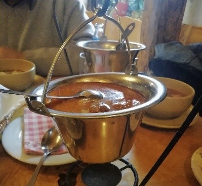 最后一天上午在ELTE讲课后,亚努斯和希尔薇娅带我去了一家乡村风格的小餐厅,位于大街一个角落,很不起眼。亚努斯是ELTE的老教授,据希尔薇娅说,他读过我写的很多文章,这次特意前来听了我的讲座。我跟希尔薇娅和亚努斯说,这次来布达佩斯的任务之一是品尝三到四个餐厅的“古拉什”(goulash):匈牙利民族特色的牛肉汤。