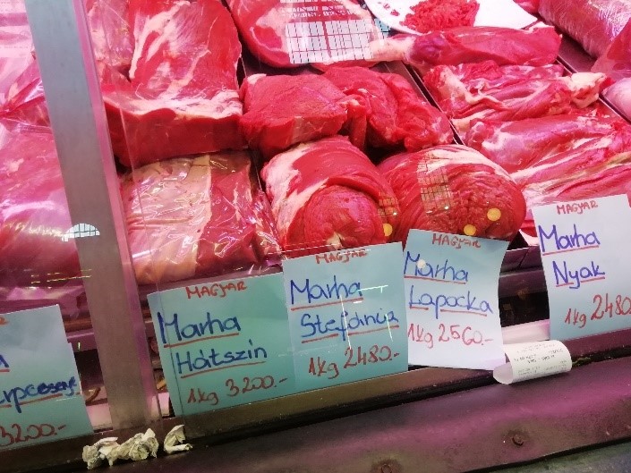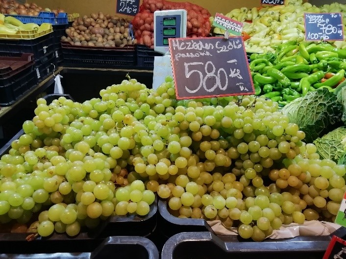来这里之前,就有人推荐布达佩斯的大集市(Great Market Hall)。它坐落在佩斯南边靠多瑙河的一个闹市区里。虽然和伊斯坦布尔的“大巴扎”比小巫见大巫,它也算布达佩斯最大的室内大卖场,下层有各种蔬菜鲜果鱼肉摊位和小吃,上层则是一个小商品市场。我比较了一下这里的蔬果肉类的价格和美国的差异。三千弗林 (约十美元) 左右一公斤牛肉相当于五美元左右一市斤,应该说比美国还要稍贵一些。蔬菜和水果则比美国便宜不少,葡萄一斤三百弗林(一美元)不到(见下图),有些蔬菜在美国要卖到三美元一磅(还不到一斤),在这里只要一美元一斤。总之匈牙利人的菜篮子还是很丰富,价格高不高,还要看收入水平和百姓的购买力。