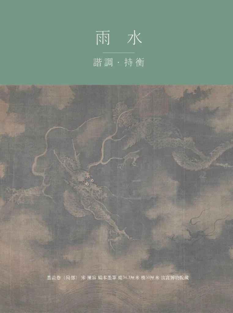答:乍暖还寒的雨水节气,仿佛从鸿蒙初开的冷酷之境渐渐苏醒,有种莫名的神秘色彩。《山海经·大荒西经》中说:“风道北来。天乃大水泉。蛇乃化为鱼,是为鱼妇。颛顼死即复稣。”仿佛天地玄黄、宇宙洪荒中自然而然的生命轮回。青龙、白虎、朱雀、玄武,“天之四灵,以正四方”。龙在我们的传说中司掌风雨雷电,唯其持衡协合,方能风调雨顺。