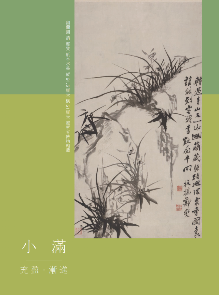 S:“小满者,物至于此小得盈满”。小满是一个“充盈·渐进”的过程,也便产生了“留白”的空间。“留白”概念存在于文人画传统中,衍化出疏朗、荒寒、空灵境界,诗无达诂,意在言外。此次“小满”节气用图,是我们所熟知的扬州八怪之郑燮郑板桥的《幽兰图》,便是“留白”这一意象空间的体现。《幽兰图》由墨笔写成,坡石疏简欹崛,略作勾勒皴擦,兰叶攒聚有致、柔韧舒展,兰花淡雅灵动,些微点缀稚竹细叶。画面浓淡相宜,疏密相生,意态天真幽远,右侧题诗点题: