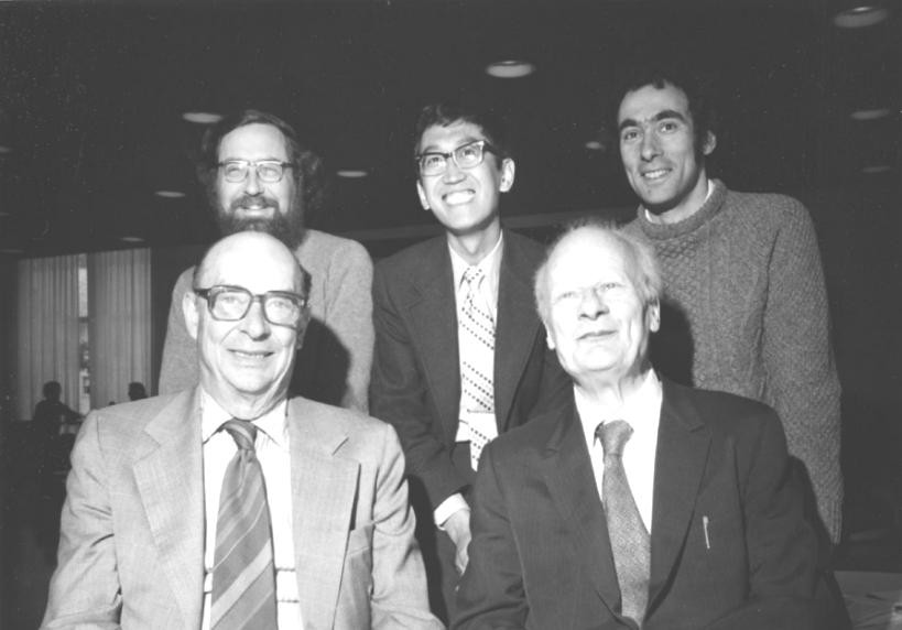 张绍晋于1977年4月在厄巴纳的卢米斯实验室与同事合影。前排,从左到右,约翰·巴丁和汉斯·贝特;后排,从左到右,克里斯·佩西克、张绍晋和戈登·贝姆。