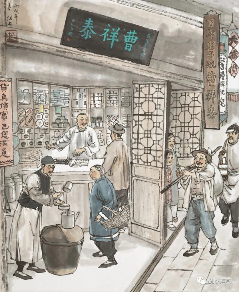 在继石兄的武汉民俗风情画中,出彩的画作多多,这里不再一一列举。我看来,萧继石的老武汉民俗风情画,妙在他植根于生活,贴近市井烟火,以平民的视角,观察百姓生存状态的细微,吃喝起居的样貌,在找寻中拾掇过往岁月中丢失的砖块与石子,在回忆中思考,在思考中展卷,为我们这些行迹匆匆的生命过程,搭建了一间遮风挡雨的人文建筑,绽放出民俗风情画的灿烂芳华。或可这样总结,萧继石的老武汉民俗风情画,可谓是从晚清至现今百余年间武汉民俗文化演进的流变图志,达成了萧继石为武汉风俗文化的传续留念,亦为武汉地方文化复兴存根的目的。
