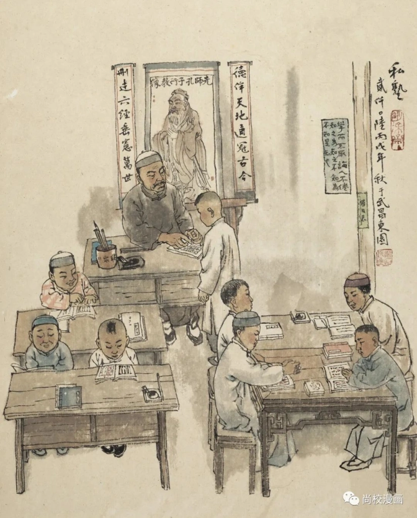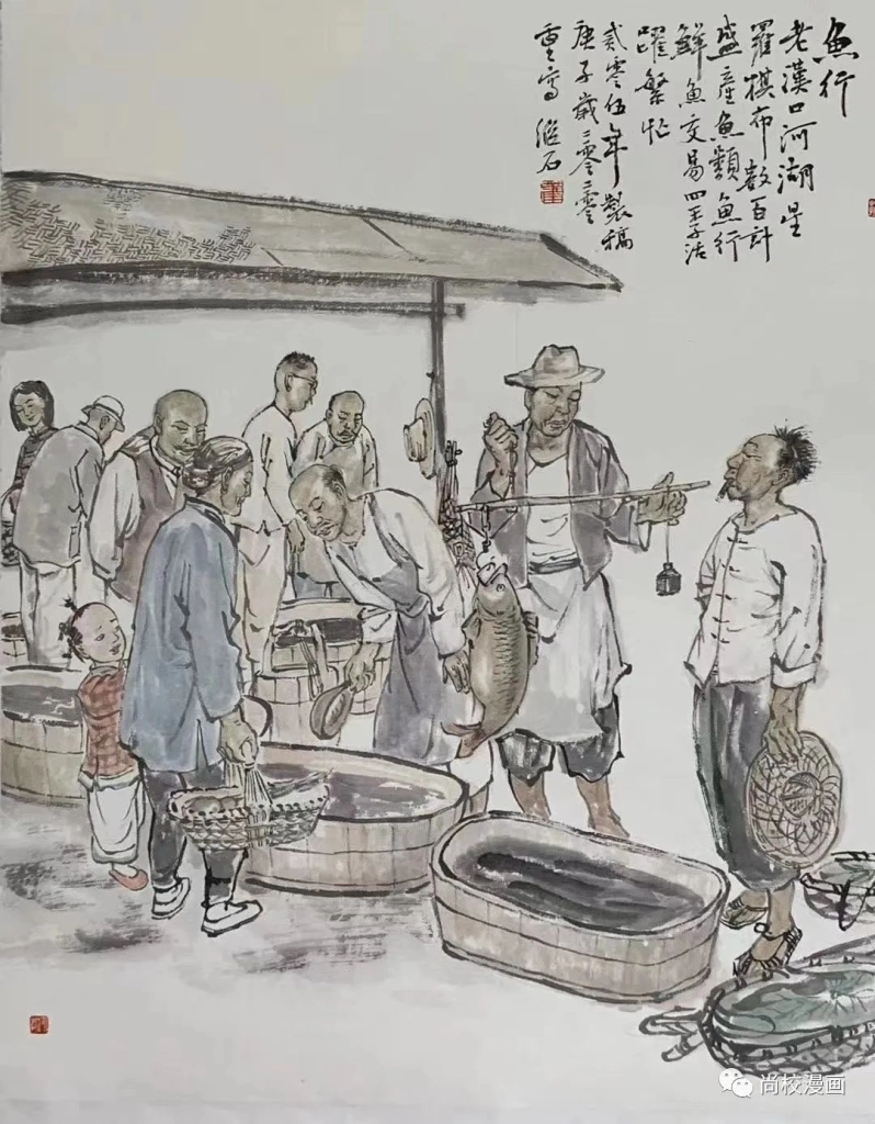 从题材上讲,他从武汉普通市民的日常生中撷取表现内容,在视角上既不是仰视,也不是俯瞰,而是以一个普通人的平视角度,细致如微地观察三镇市民衣食住行读书课字等生活细节和场景,考察了解不同时期,人们所穿不同的衣服,用不同的用具和不同的就食饮宴活动场面,等等,然后用从记忆中打捞的历史作经线,以自己的认知、画艺作纬线,编织成了一幅幅还原历史的图像,让老武汉人的生活“味道”扑面而来,具有真实可信的感人力量。如《私塾》组合了8个孩童和一位先生,课桌、笔砚、竖排课本等元素,记录了民国时期以及解放初期有钱人家的子弟读私塾的情形。旧时有钱人家把自己和亲友家的孩子拢在一起,有三五个孩子便可请一位先生,把自家屋舍的厢房充当教室,延聘先生上课,课本多为四书五经、《三字经》,是谓私塾。一般人家的孩子,也可就近找一家私塾就读。读私塾的费用,比读新式学堂的费用低。私塾在旧时武汉很普遍,现在私塾早已退出了历史的舞台,读私塾的情形只留在上了年岁的老武汉人的记忆之中,继石兄用画面呈现了这种记忆。