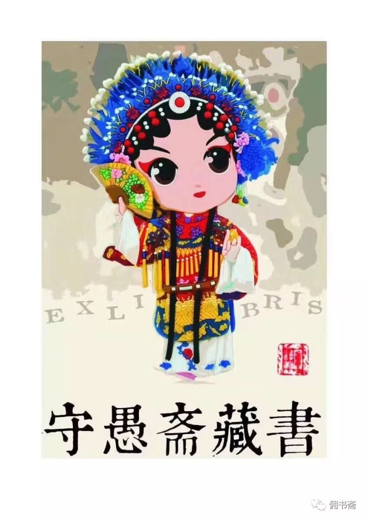 观赏文川先生的藏书票,虽不乏“拿来主义”、对西方书票有所借鉴的作品,但堪称佳构的,还是那些具有中国木刻版画特色的作品。如《守愚斋藏书》票,一小女孩扮花旦持花扇造形,工笔细致,但又似水粉,正是“霓裳霞帔步摇冠,钿璎累累佩珊珊”,体现了票主戏剧工作者的身份。人物巨眼炯炯,有思无邪。背景却好似水墨写意,设三重色,从下至上,由浅渐浓,意为“云山几盘”?拟或“江流几湾”?