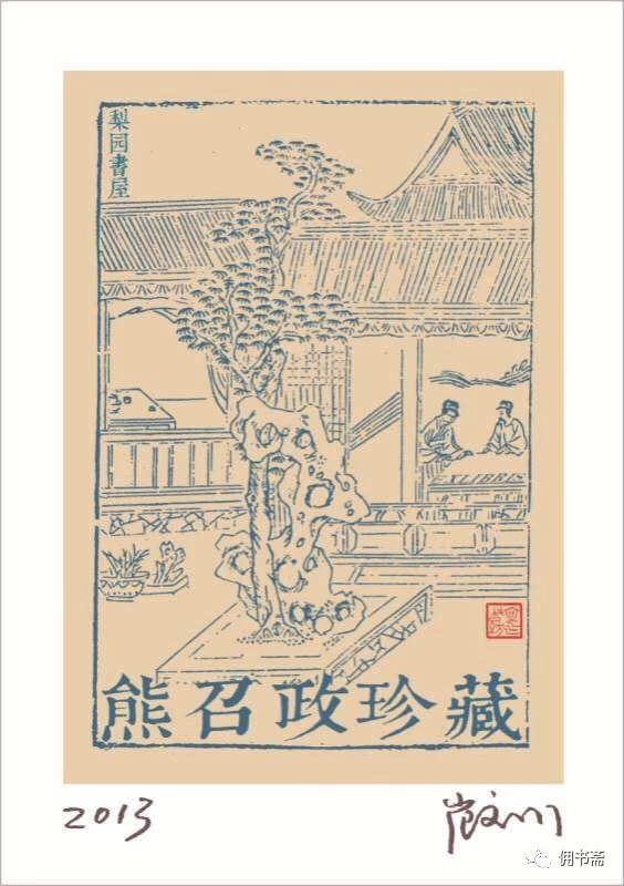 又如《熊召政珍藏》票,黄底蓝线,并非广厦阔院,但形制佳胜,园中设多孔石山、植罗汉针松,两古人偏于一隅,抚案对谈。所谈何事?莫非“每叹忠臣多取祸,更求史笔辩群诬?”书票左上一角,竖写“梨园书屋”四字,使我想起上世纪九十年代中期,票主正构思写作《张居正》时,经徐鲁兄引荐,一同往访梨园书屋的情景。