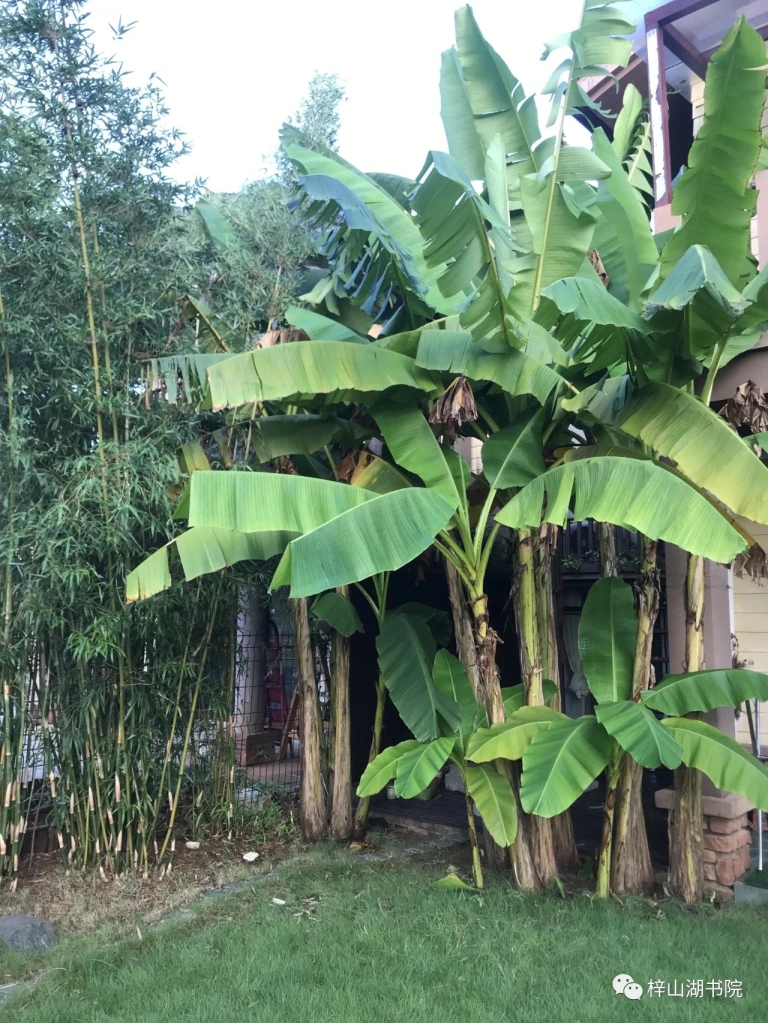 小院生命力最旺盛莫过芭蕉树。多年前余往神农架开笔会,途中停车小憩时,以十元币请路旁人家挖了一株芭蕉苗,带回汉后在晒台上培育长大,不期遭遇严冬冰雪冻死,根部劫后余生冒出新芽,余精心呵护至尺余高,再移植到小院。芭蕉苗不负余,历几载风雨,长成两簇十余棵芭蕉树,蔚然成林。其阔长叶片撑起偌大绿伞,夏日炎炎时格外醒目。若起风时,芭叶起舞如凌波荡桨,逢走暴时,雨打芭蕉似鞭炮劈啪作响。