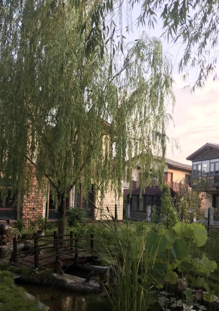 几年过去,二柳树梢已高过屋顶,树冠荫庇小半院落。余每每驻足小木桥,凭栏旁观歪脖柳恣意歪到院墙外,闲瞧垂柳柳辫轻巧拂过池面,很是惬意。