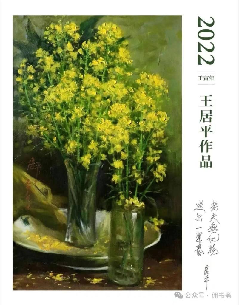 《油菜花》是一幅油画静物,见于一种挂历封面。封面有手写题言:“老夫无他物,送尔一案春——居平”。老画家王居平先生女儿王乔女士赠,时在二0二二年元月。