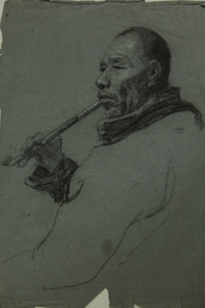 “乌江上的艄公”是1968年深入生活时在乌江木船上,画那掌舵的艄公师傅,以雕塑般的手法去塑造船夫刚毅耐劳的形象。我大多喜欢依着对象、人物的个性面貌,依着我的感受,寻找一种更能表达对象个性并具有一定表现意味的艺术手法。