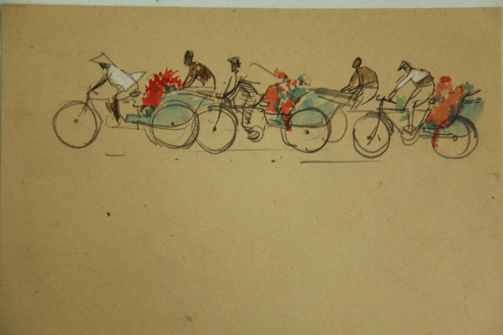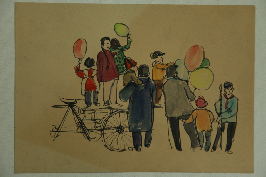 画于1960年的两幅北京五一节的速写,那时我还在读央美大一,初习速写。那一溜送花的三轮车队,画于天安门广场,富有动感和节奏的简洁线条传达了节日前那些工人的忙碌和轻松的心情。那大人带着手牵气球的儿童,是在劳动人民文化宫画的,洋溢着节日喜庆祥和的气氛,水彩色都是回宿舍凭记忆后加上的。我也是第一次在北京过五一节,自己的心情比市民们还兴奋哩!