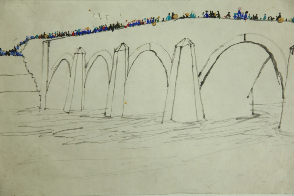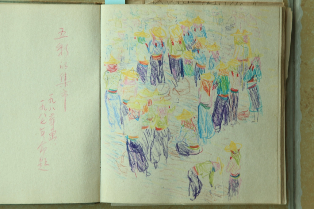 画于贵州惠水县城的圩日桥上那幅,现场的感觉使我夸大了人物与桥的大小比例,用色彩点画出少数民族的美丽身影,而其余仅用寥寥数笔淡墨勾画,别有一番情趣,自己也感到挺满意的。