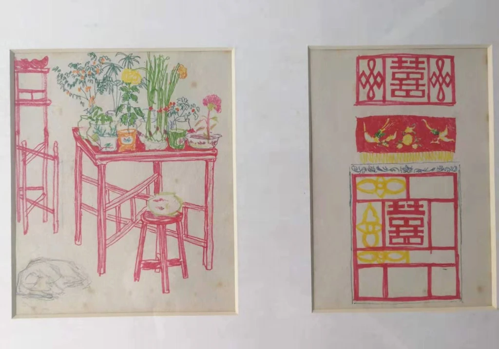 画于惠安的《净峰集市》,当时我很兴奋,用彩色铅笔捕捉集市的阳光与色彩的气氛,没想到这张速写后来孕育出我的“闽南红”系列的一幅最重要的代表作:三联画《大集市》——源于那集市的现场及自己多方位的生活感受的复合而形成的构思 !同一次在惠安写生时画的《惠安渔家室内》后来也形成了另一幅“闽南红”的重要代表作《渔家过厅》。