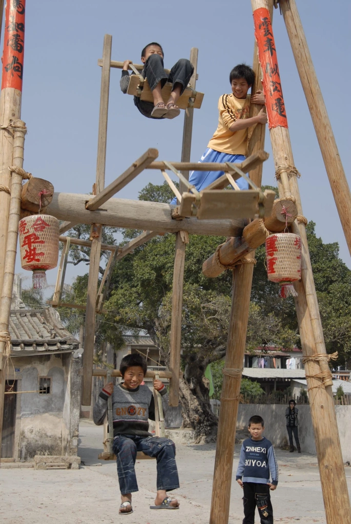 今天,潮汕荡秋千仍以澄海古辟望港口乡、澄海隆都后沟乡,揭阳市砲台镇桃山乡、潮安县庵埠镇仙溪乡、亭厦乡等较为著名。秋千架一般设于宗祠前广埕,以竹木为架,高达二三层楼,上系板垫,可在空中旋转翻滚,状如今天的“摩天轮”。春节后开始搭建,由乡里添丁者出钱,元宵过后即拆去。在这段时间里,乡中男女老幼都可上秋千架荡秋千,但在揭阳市砲台镇桃山乡,到了元宵这一天晚上,只能由女人独占秋千,男士只好站在一旁欣赏。这应是一种古俗,大概是古人想为元宵这个中国“情人节”增加点气氛吧。