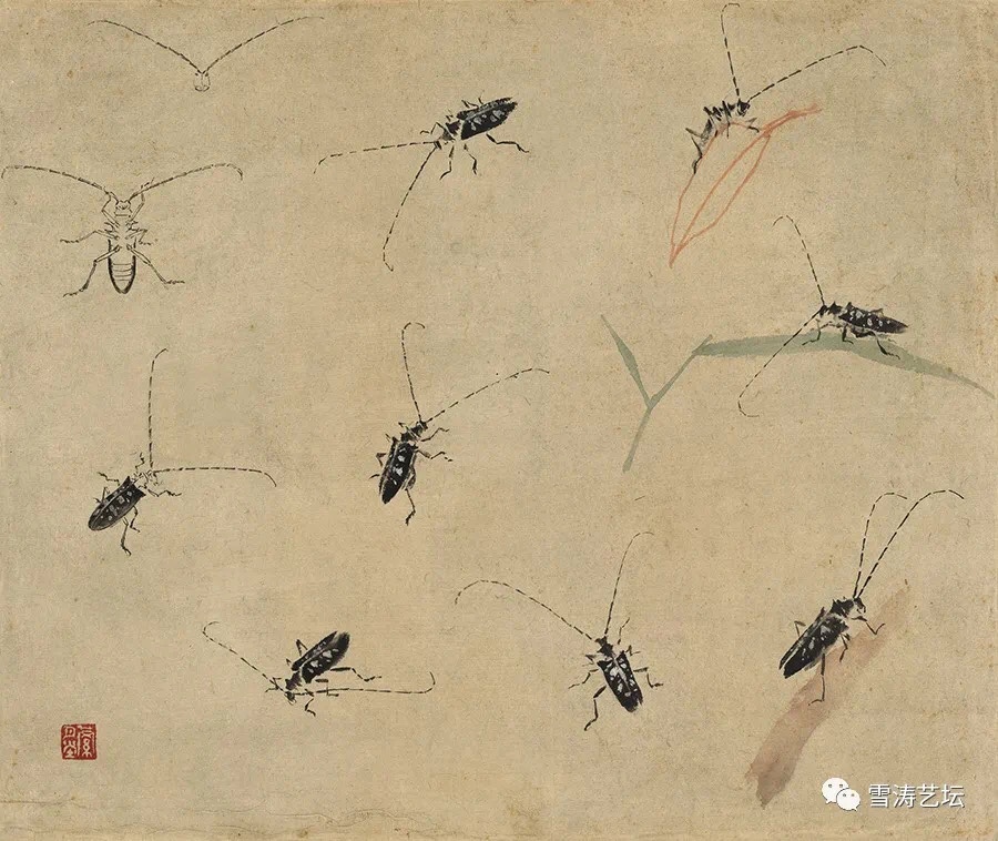 最后俏是俊俏、俏丽、峭拔,偶尔有些俏皮。他画中露出的花尖、叶尖、鸟的嘴、鸟的尾全是“俏”,就像京剧里的武生亮相,是最吸引人眼球的。 如他画蝈蝈、天牛的须各不相同,很有劲儿,很有趣儿,都像是活的一样。