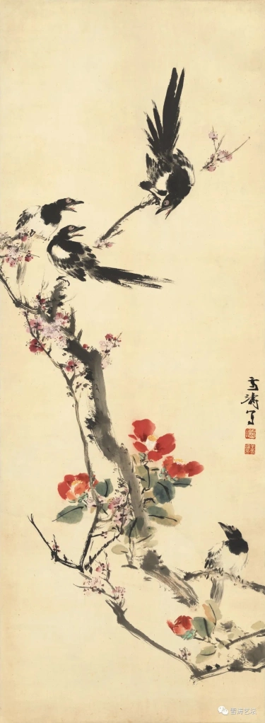 《四季花鸟之冬》画中有很多留白好像被这些花给占满了。一枝梅干,几朵山茶,四只喜鹊张嘴叫喳喳,尾巴翘到很高,美而生动的景象是他的特点所在。