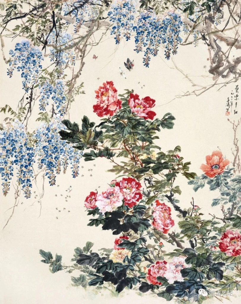《万紫千红》也是我很喜欢的一幅。牡丹盛放,紫藤婆娑。在这一代老画家里,他画的牡丹最好,有大突破也很精。吸收了水彩、水粉,甚至照相技术特点,画出了体积,以及各种不同的正、侧姿态,满目春光。
