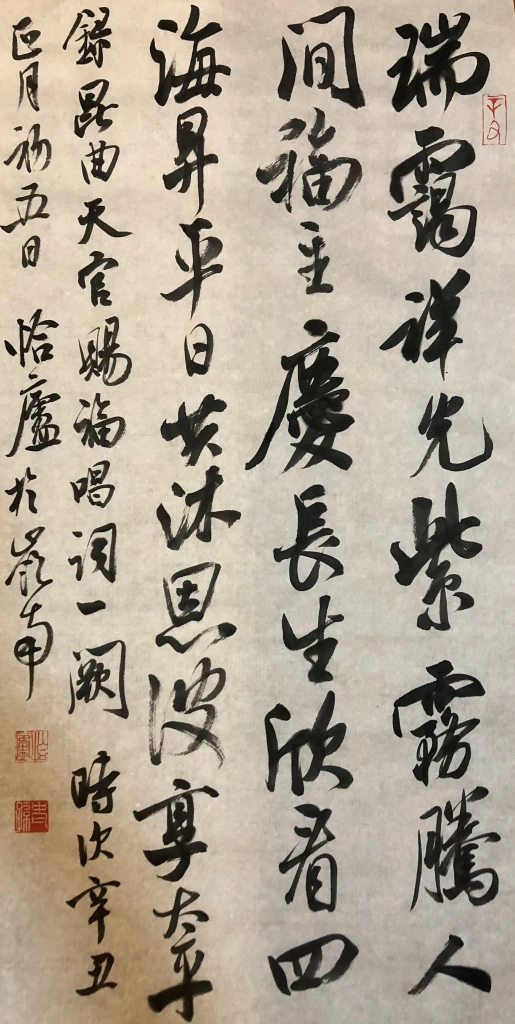 今日写字,发现前天磨的墨呈现了“宿墨”之效果,不禁思绪回到艺考时的光景。那时流行用宿墨兑红星,墨色便能漆黑一片。彼时备考,每日都会消耗掉大量的纸墨,所用皆是廉价品。考试时也都是极为廉价的宣纸,为了保证水平稳定的发挥,只能用重胶的墨,兑宿墨则是让墨色看起来黑一些。如今又呈现出这样的墨色了,却是偶然而成且是磨的油烟墨,远非当年之墨了。今天写点应景内容,抄录昆曲《天官赐福》中的一阙唱词,祈愿各位朋友新年财资充足!