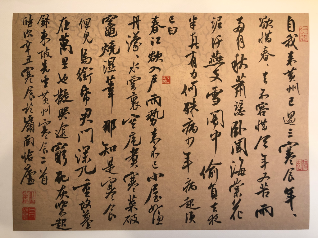 今朝又逢寒食,最近几年寒食节我都会书录苏轼的《黄州寒食二首》。这两首诗怕是我最不想读的诗,每每读完便已衣襟潸潸。高超的艺术便是如此,极具感染力。对于苏字,我也极爱,早岁学书时还曾学过东坡的大楷,后来其行书手札也是常常临习的法帖。去年寒食写的是大字,写的很是酣畅淋漓。今朝则是用旧日本花笺所书,有点接近宋人所用纸张的书写感觉。材料也是这几年我大力研究和提倡的,材料越是接近古人则越能还原古人的书写状态。