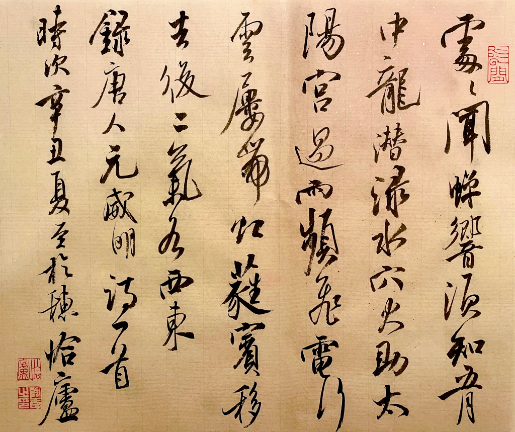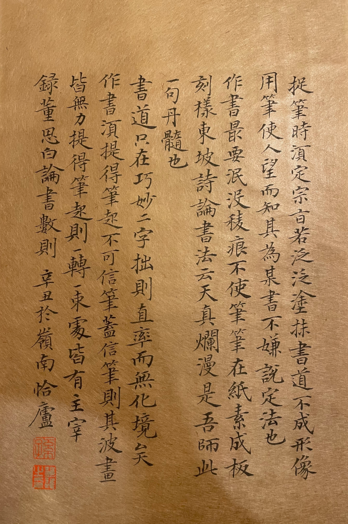 这几年很少写小字,主要是目力不济。写完看看,总算没浪费一张佳纸。这是朋友所赠,当代按照古法所制之皮纸,草木染色、手工砑光。虽是一小枚,但是其中繁复程度则是丝毫没有减少。在这样的纸上写字,手感极好,非常舒畅。用此皮纸、松烟墨、狼毫有心笔,能够达到和古人相同之书写状态,又岂能不出精品呢?